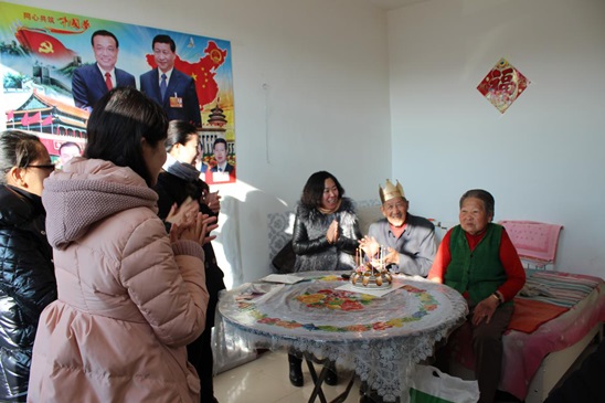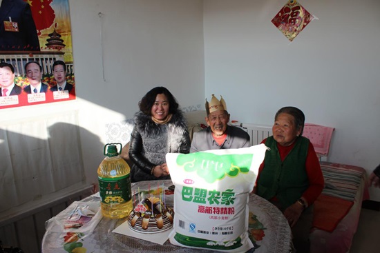 2015年12月24日,石拐区卫计局副局长张敏带领区卫计局、区计生协会工作人员走进吉忽伦图苏木爬榆树嘎查,为住在互助幸福大院里的李翻老人过生日,向老人送上健康长寿的生日祝福的同时,也为老人一家送去了食用油、面粉等生活用品。